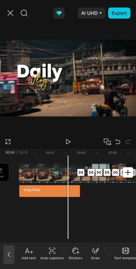 Friends, video ko interesting banane ke liye aapko text add karna hoga. Iske liye text par click karo, phir add text par click karo aur “vlog” likho. Uske baad templates me jao, koi suitable template select karo, apply karo aur text ko side me properly adjust karo.