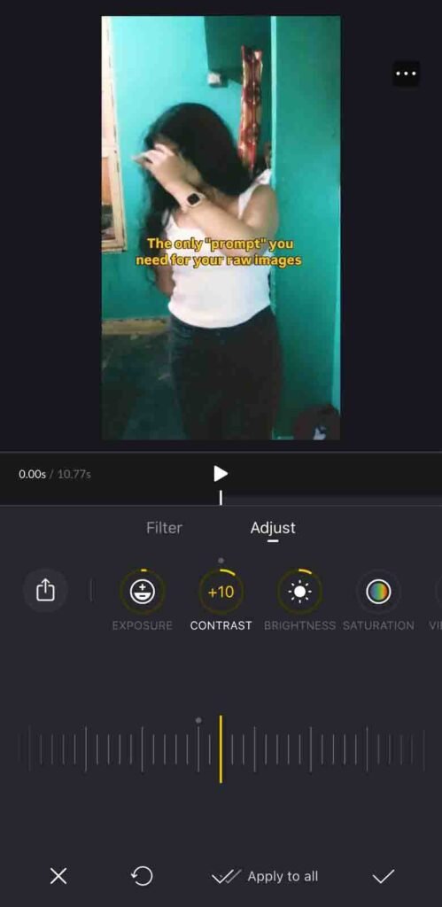 Aap ek click me filter apply kar sakte ho ya Adjust me jaakar manually brightness, contrast aur saturation set kar sakte ho.